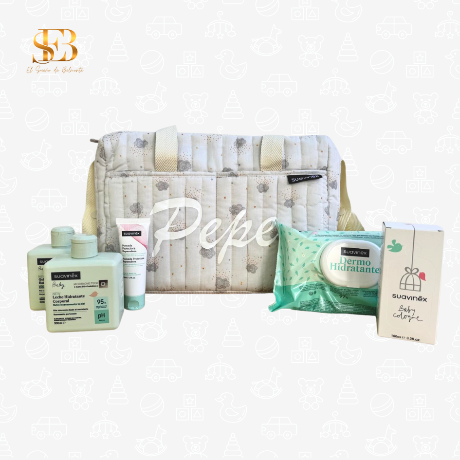 Un bolso personalizado con 5 productos Suavinex: Baby Cologne, Gel-Champú Syndet, Loción Corporal, Pomada de Pañal y Toallitas Dermohidratantes.